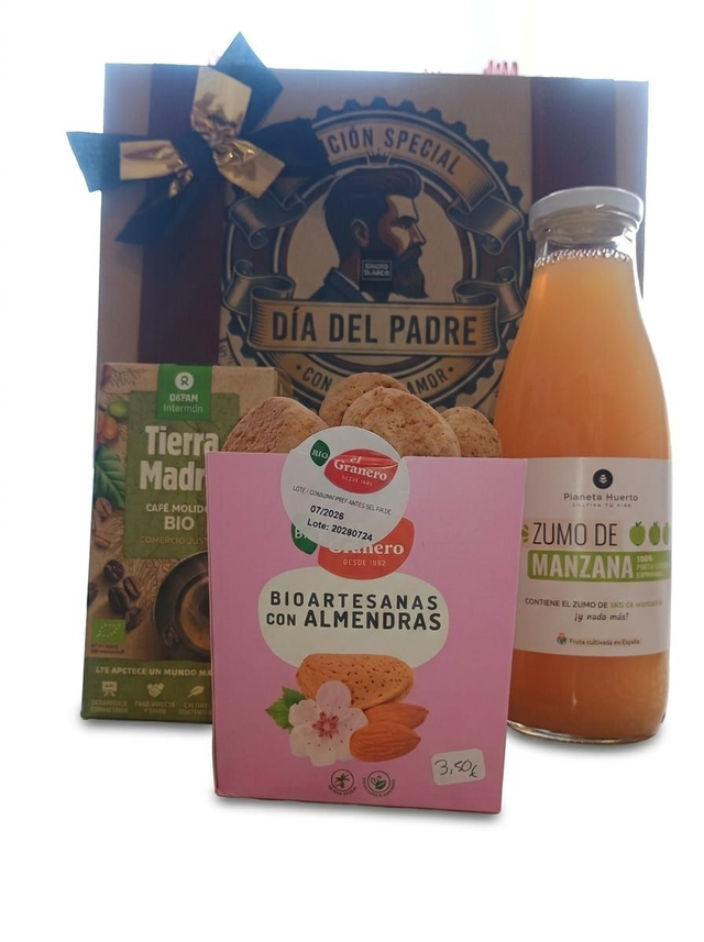 Incluye café ecológico de comercio justo, zumo natural (MANZANA) y galletas artesanas con almendra. Una opción equilibrada, natural y perfecta para un desayuno especial.